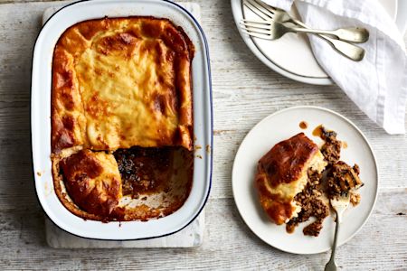 Layer the aubergine slices and lamb in an ovenproof dish, finishing with a final layer of aubergine. Pour the sauce over the top then bake for 35-40 minutes; the topping should be risen and golden brown. Leave to cool for a few minutes before serving.
