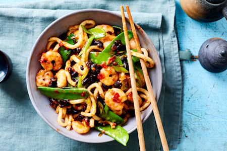 Set a wok over a high heat until smoking then add half of the oil. Add the prawns, ginger and garlic and stir fry for a couple of minutes until the prawns turn pink. Tip everything onto a plate then add the remaining oil to the wok. Add the mangetout, spring onions and noodles and fry for a couple of minutes. Stir in the black beans, chilli bean sauce and soy sauce then return the prawns to the wok and toss through the noodles. Transfer to a warm bowl and serve.