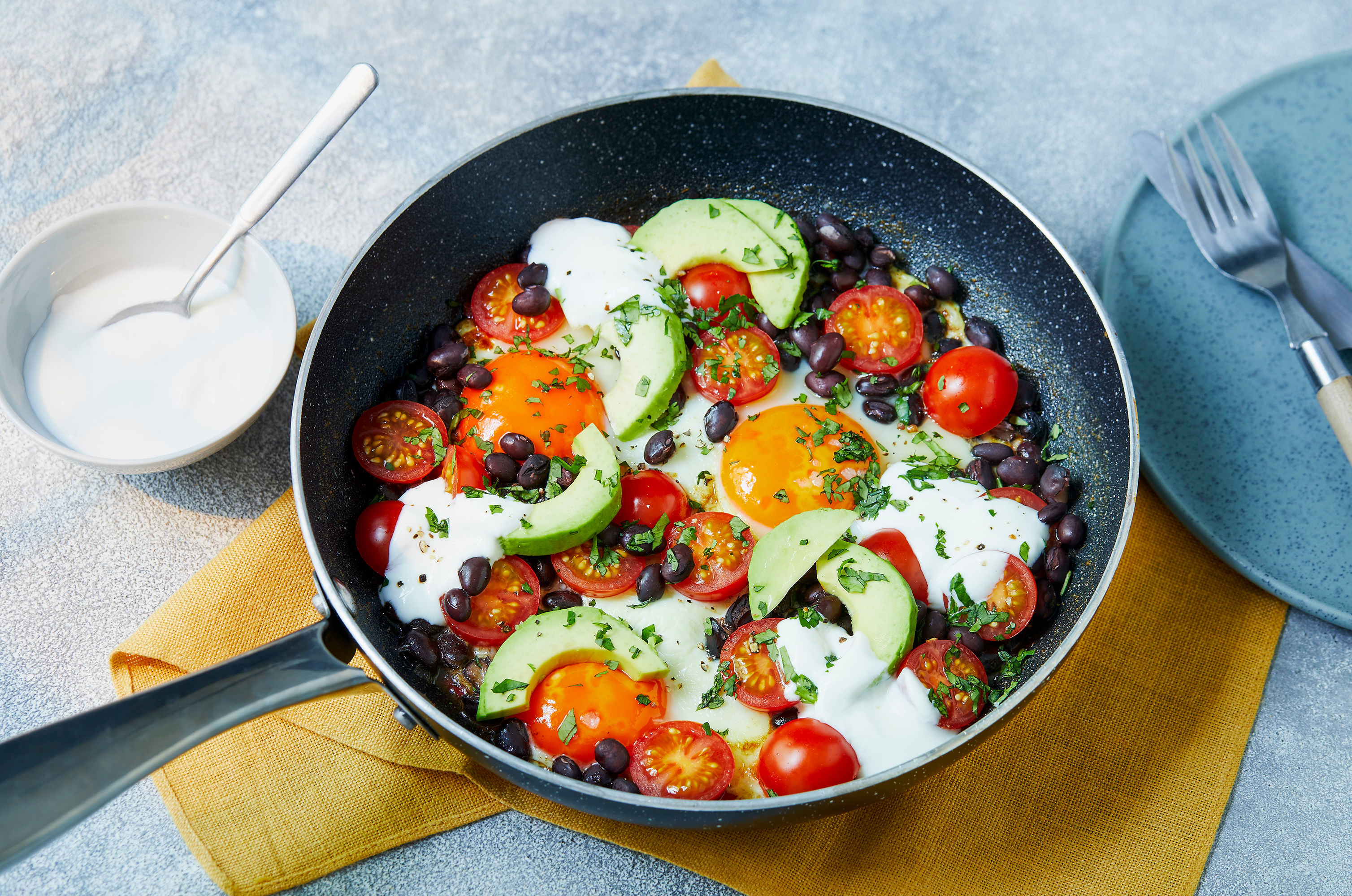 Gently crack the eggs into the pan. When they start to set, add the tomatoes, black beans and a spoonful or two of the liquid into the pan around the eggs. Leave to warm through then serve with the avocado, yoghurt and coriander leaves.