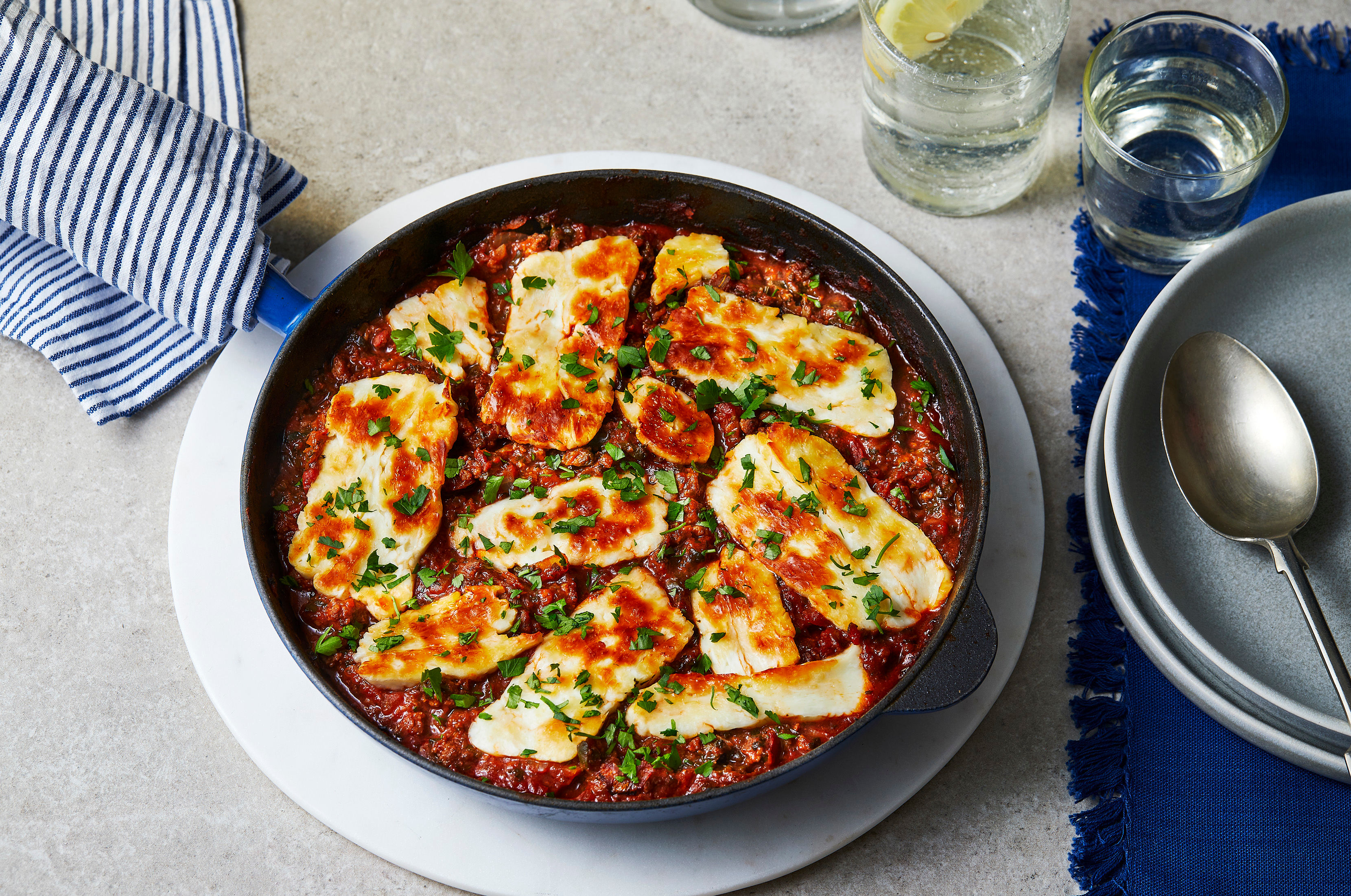 Heat the grill to high. Lay the halloumi over the top of the mince before placing under the grill for a few minutes to turn golden.