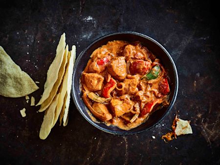 Tip the onion, peppers, tomato and garlic into the pan and fry for 7-8 minutes until softened. Add the spices, fry for a minute then stir in the tomato purée and almond butter. Add a splash of water, return the chicken to the pan and cook for 2-3 minutes until the sauce has thickened and the chicken is cooked through.