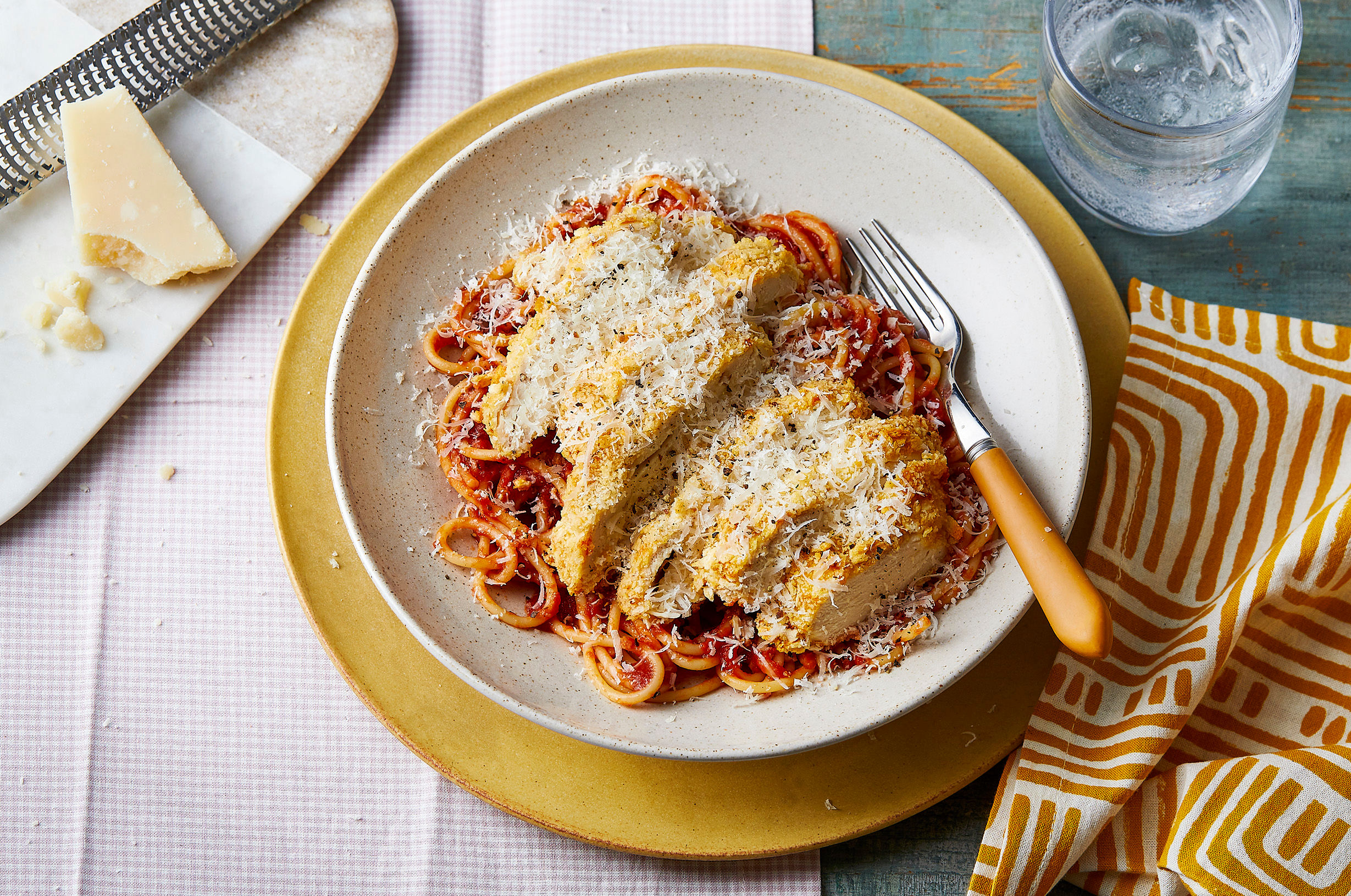 Cook the spaghetti to pack instructions in a pan of salted water then drain and stir through the passata. Season to taste then slice the chicken and serve on top of the spaghetti. Finish by sprinkling over the parmesan.