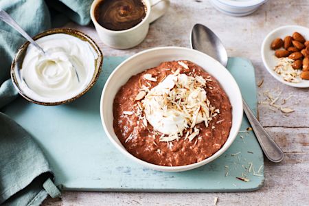 The next morning stir in the yoghurt and serve topped with the sliced almonds.