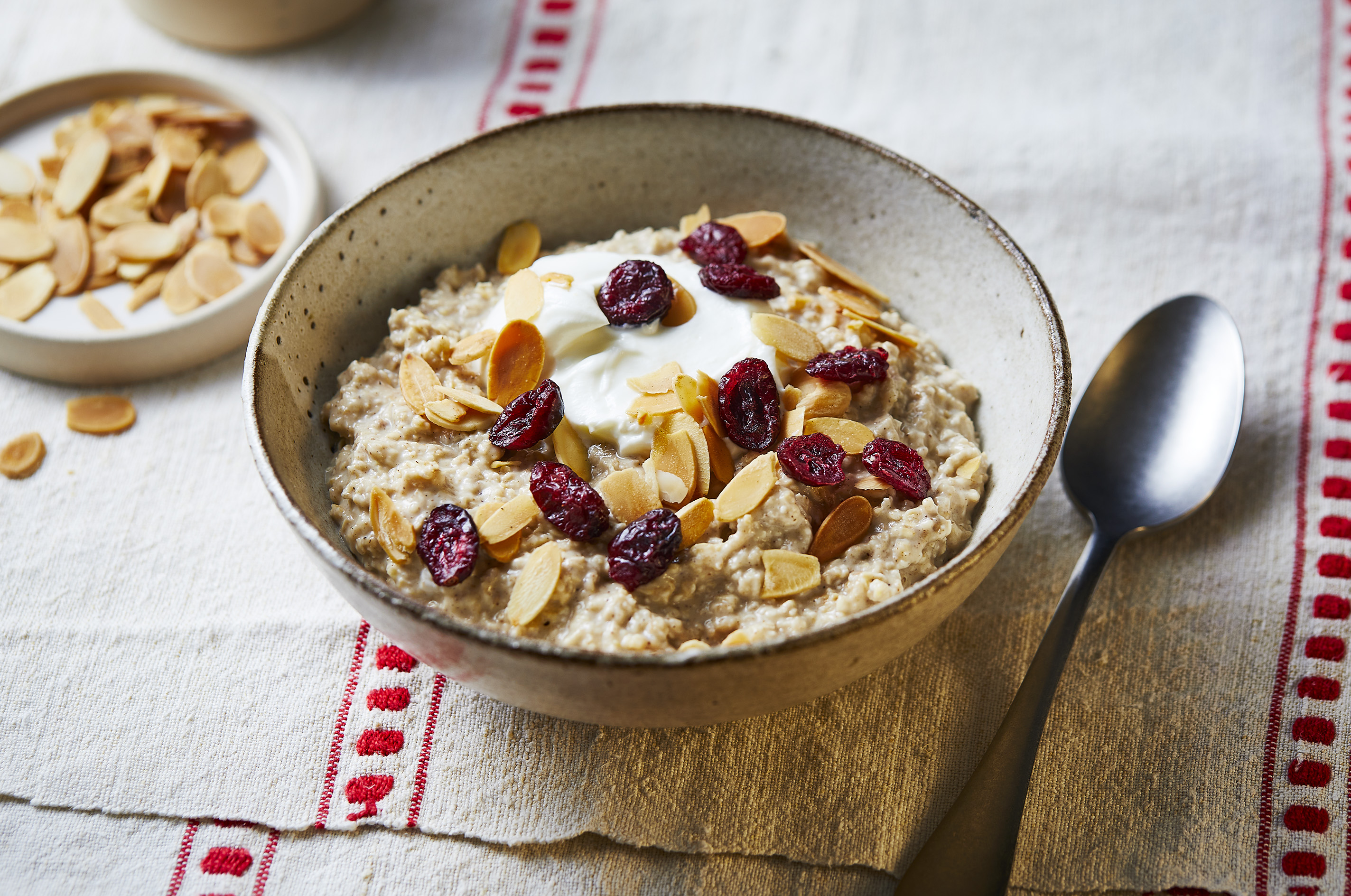 Serve with the remaining yoghurt, cranberries and flaked almonds.