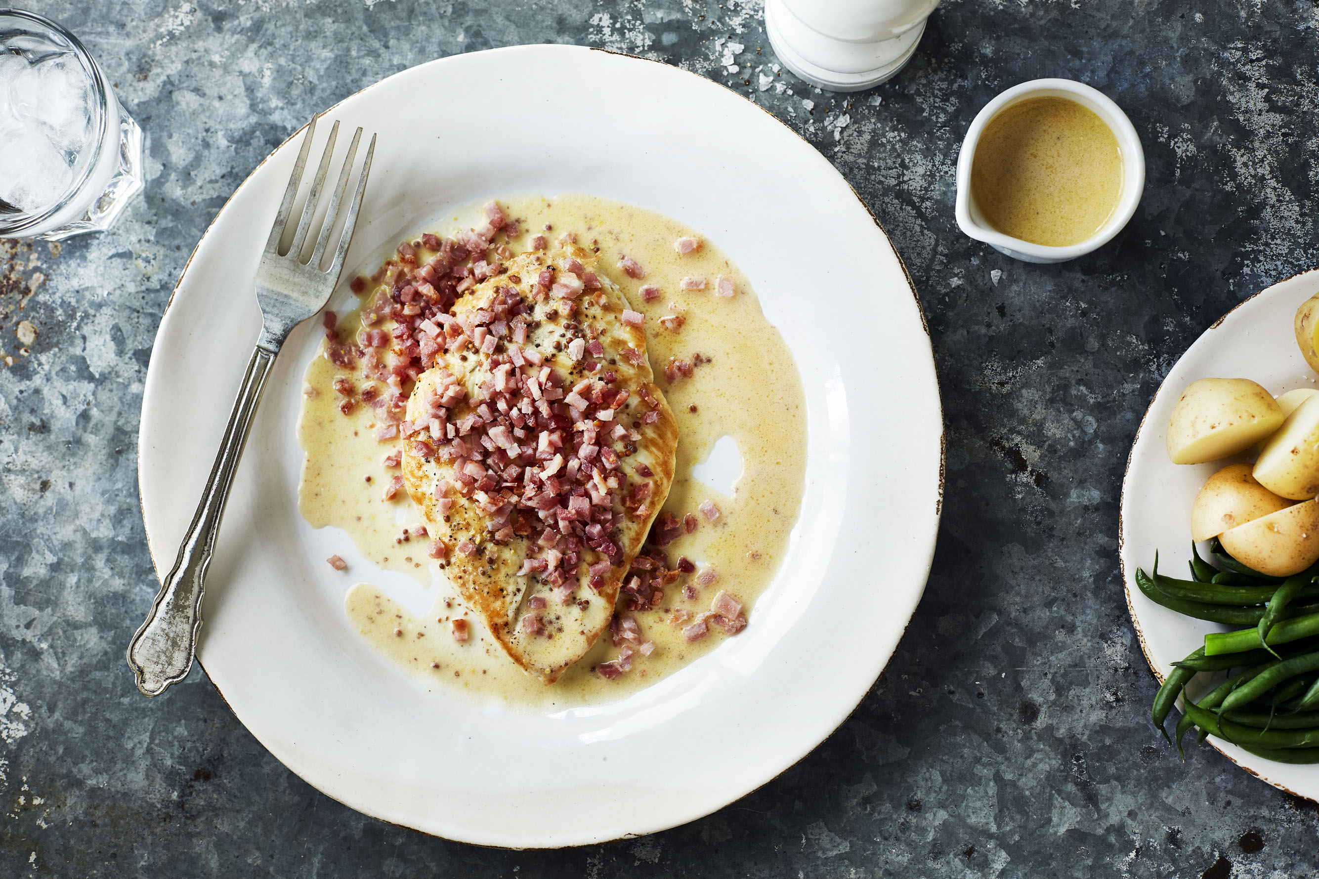 Lay the chicken on a plate, pour over the mustard sauce and top with the crispy bacon. Serve with new potatoes and green beans.
