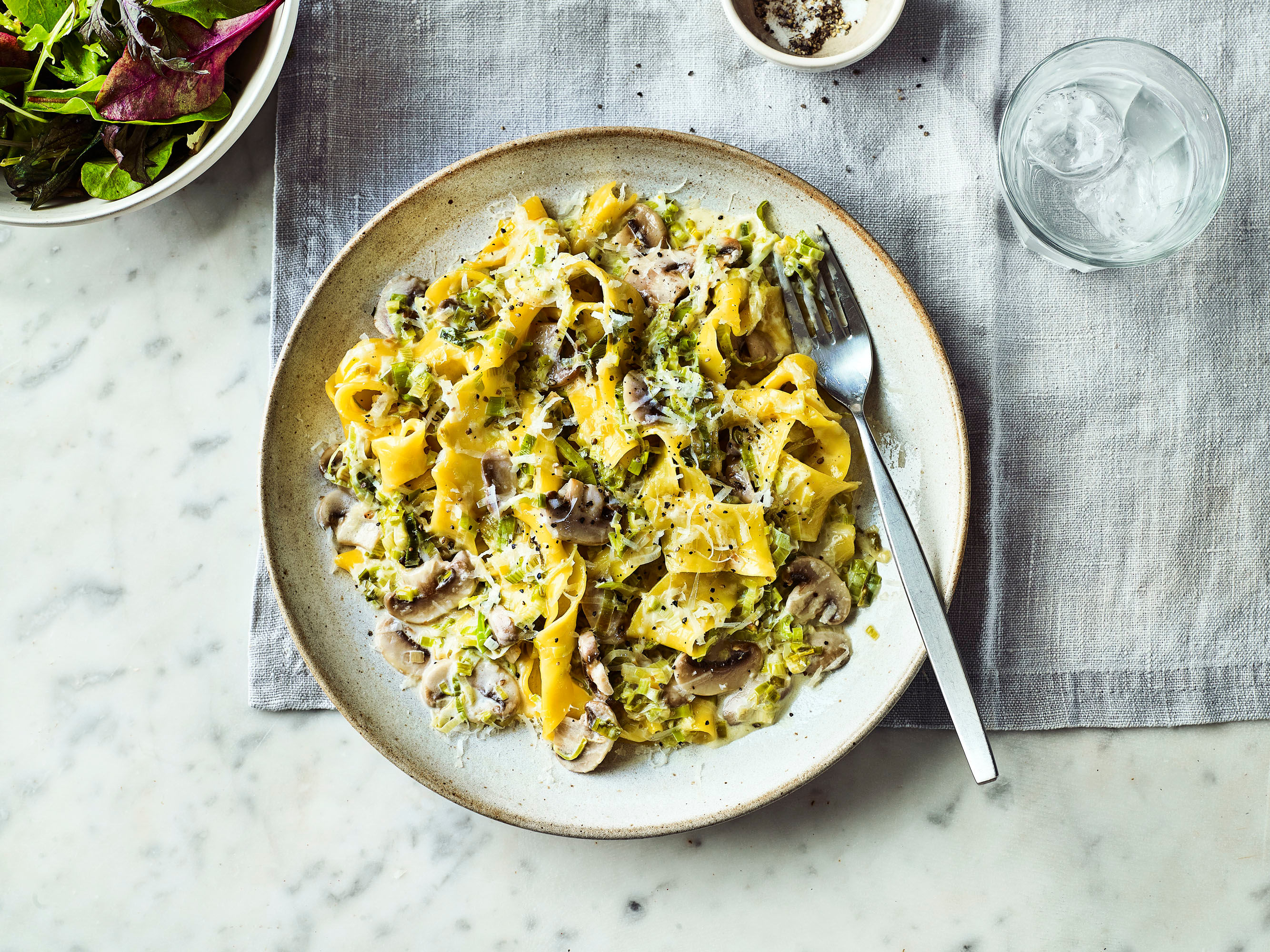 Meanwhile cook the pasta according to the packet instructions then drain, reserving a little of the cooking water. Tip the pasta into the pan with the leeks then toss to combine, adding a little of the re-served cooking water to loosen.