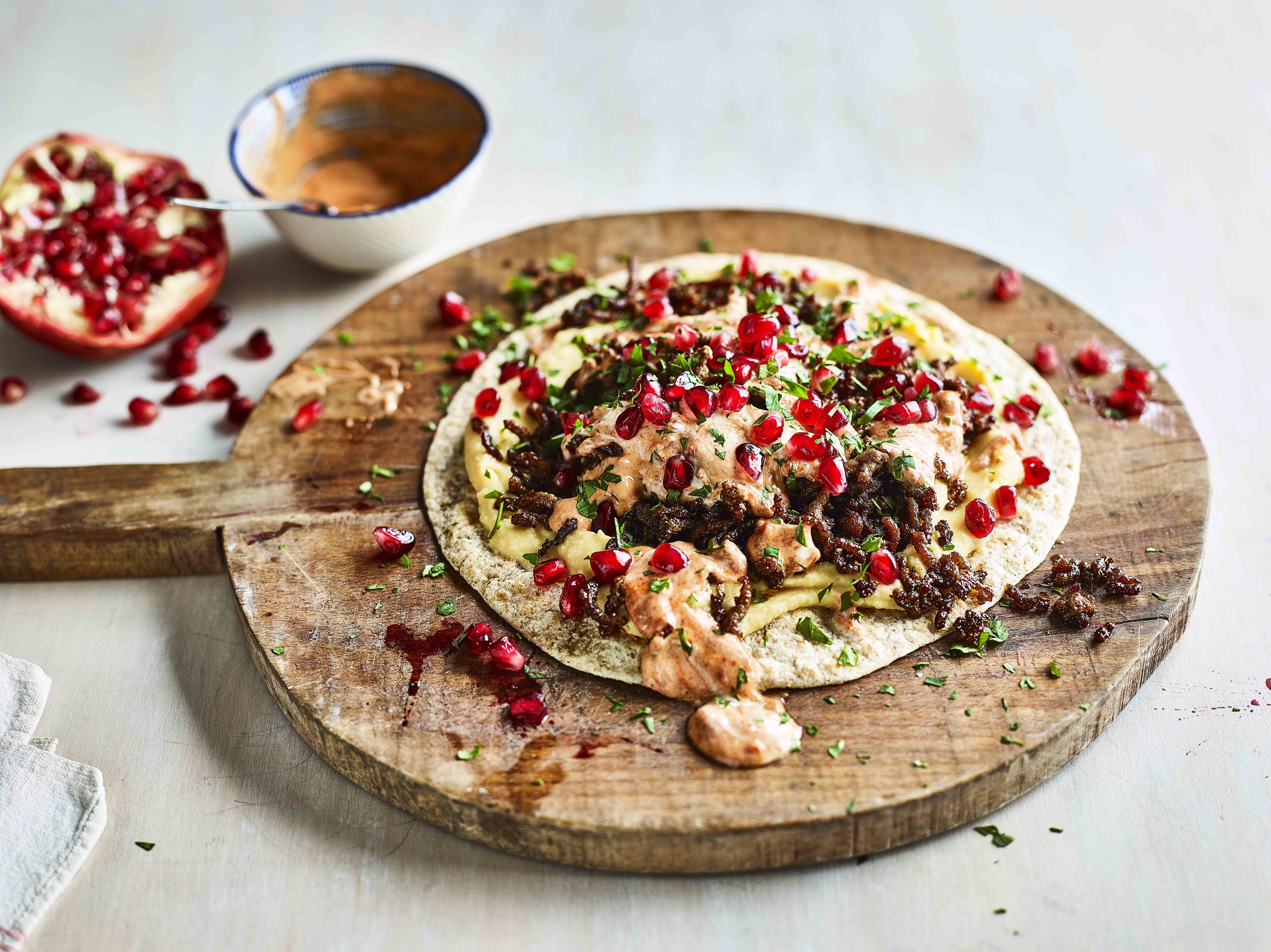 Warm the flatbread in the toaster or under the grill then spread with the houmous. Pile the beef on top then mix together the yoghurt and harissa and drizzle over the top. Scatter over the pomegranate seeds and parsley and serve with a simple green salad.