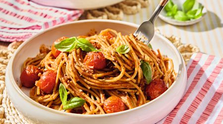 Next try the Roasted Cherry Tomato & Pesto Pasta – my kids love the tomatoey-pesto pasta mash-up. No chopping needed for this one, just bang all the pasta sauce ingredients into a roasting tin, roast, and toss through wholewheat spaghetti. Easy!