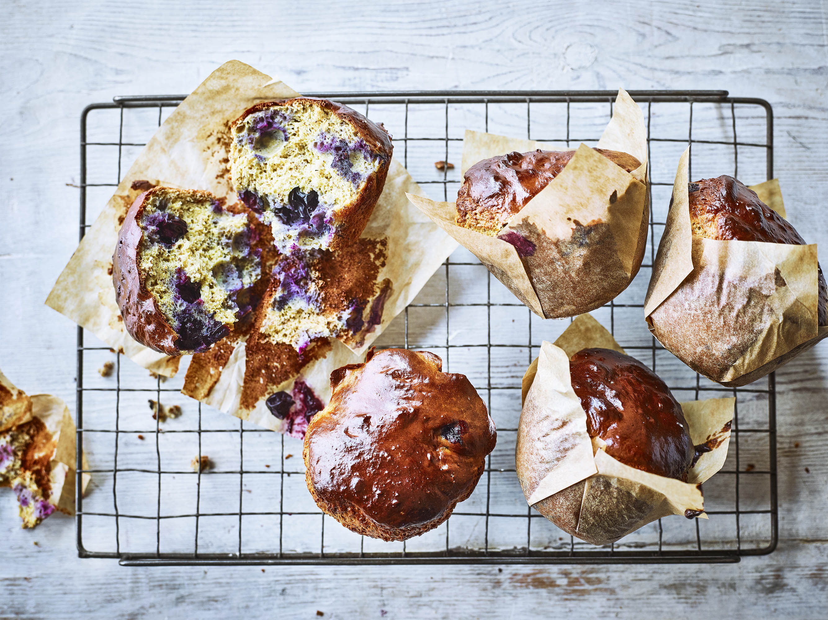 Fold in the blueberries then divide the mixture between a 12-hole muffin tin lined with paper cases. Bake for 20-25 minutes until risen and golden then remove from the oven and leave to cool.