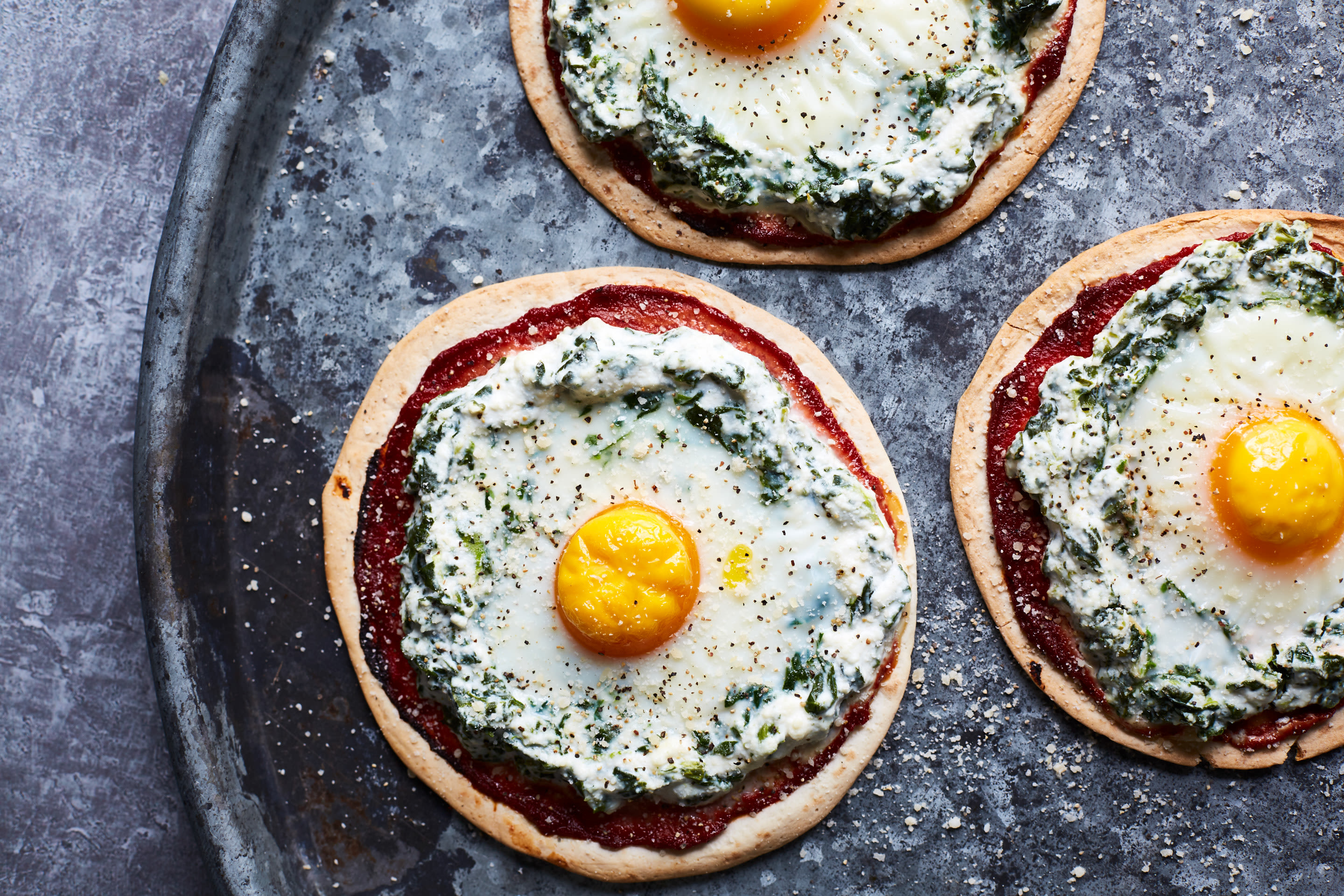 Spread the mini tortillas with the tomato purée and place on a lined baking tray. Divide the ricotta mixture between them and use a spoon to make a well in the middle. Carefully crack an egg into the well and sprinkle over the parmesan.