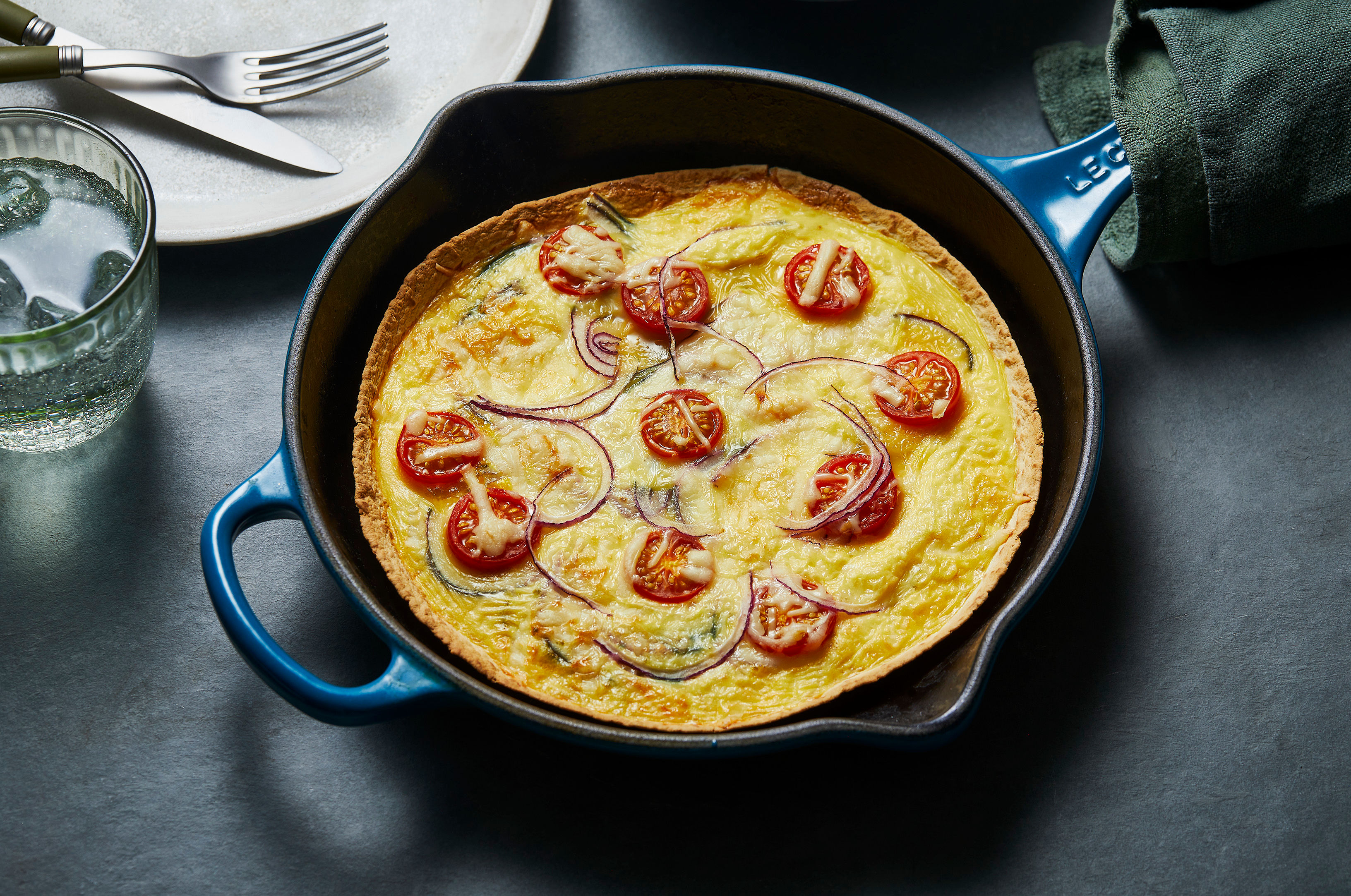 Place the tortilla wrap in a frying pan making sure that the edges are just turned up. Pour the egg mix onto the tortilla being careful to make sure it doesn't go over the sides, then scatter over the tomatoes, red onion and cheese.