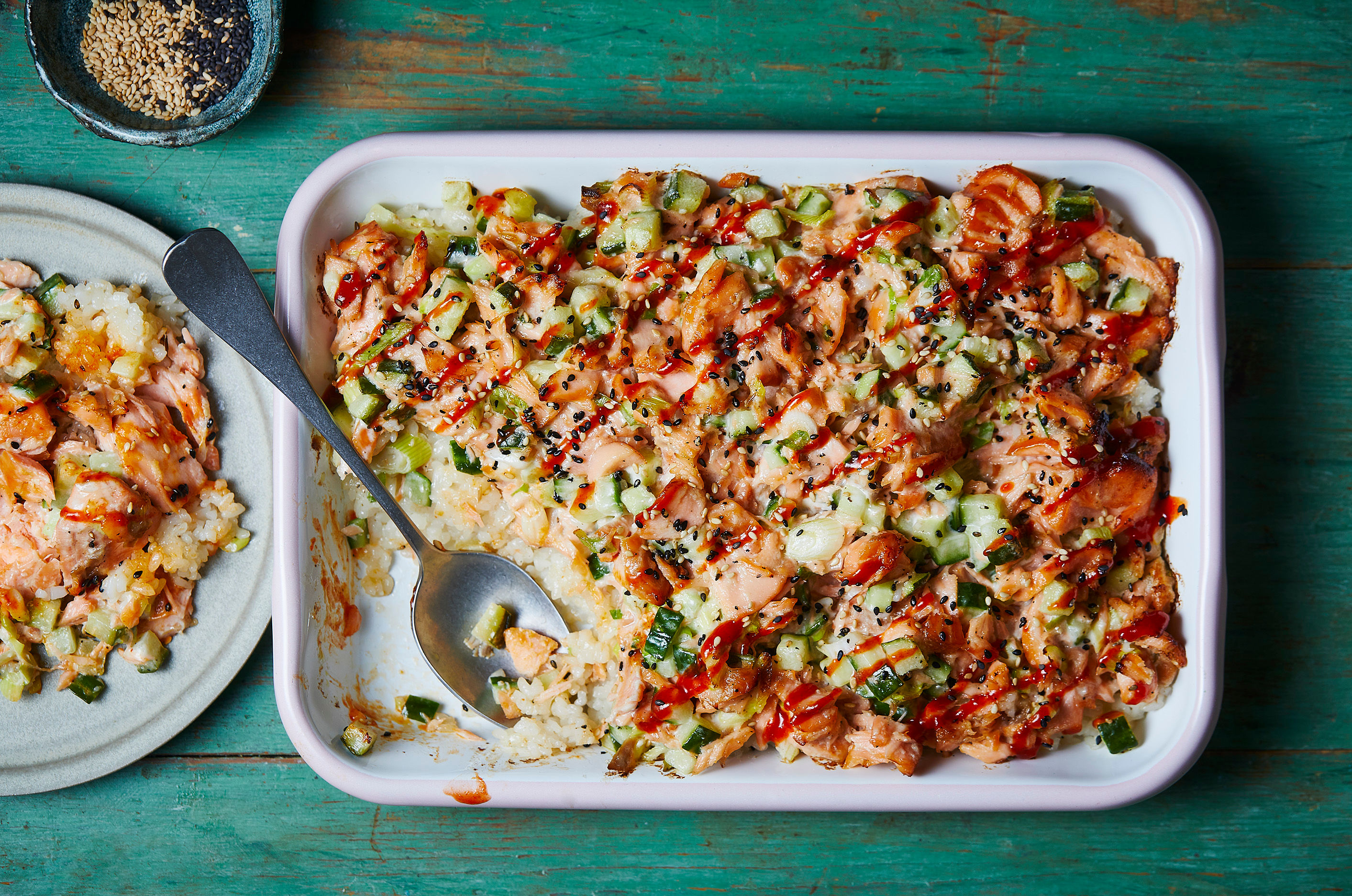 Spread the cooked rice over the bottom of a roasting pan then spread the salmon mixture over the top. Bake in the oven for 10 minutes until the salmon is just starting to crisp on the top.