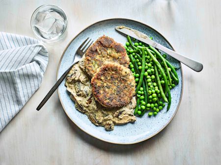 Increase the heat, add the mushrooms and garlic and fry for a few minutes until softened. Meanwhile cook the beans and peas in a pan of boiling water for a few minutes then drain. Remove the pan with the mushrooms from the heat, stir in the mustard and crème fraîche then season to taste. Serve the pork schnitzel with the creamy mushrooms, beans and peas.