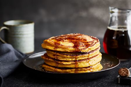 Melt the oil in a non-stick frying pan over a low to medium heat then pour in large spoonfuls of the batter. Cook for 2-3 minutes until bubbles start to form on the surface of the batter, then flip and cook for a further 1-2 minutes. Transfer the pancakes to a plate then top with a little more nutmeg and drizzle over the maple syrup.