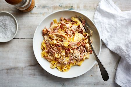 Drain the pasta, reserving a little of the cooking water. Add the cooked pasta to the pan with the chicken and ham and toss to coat.