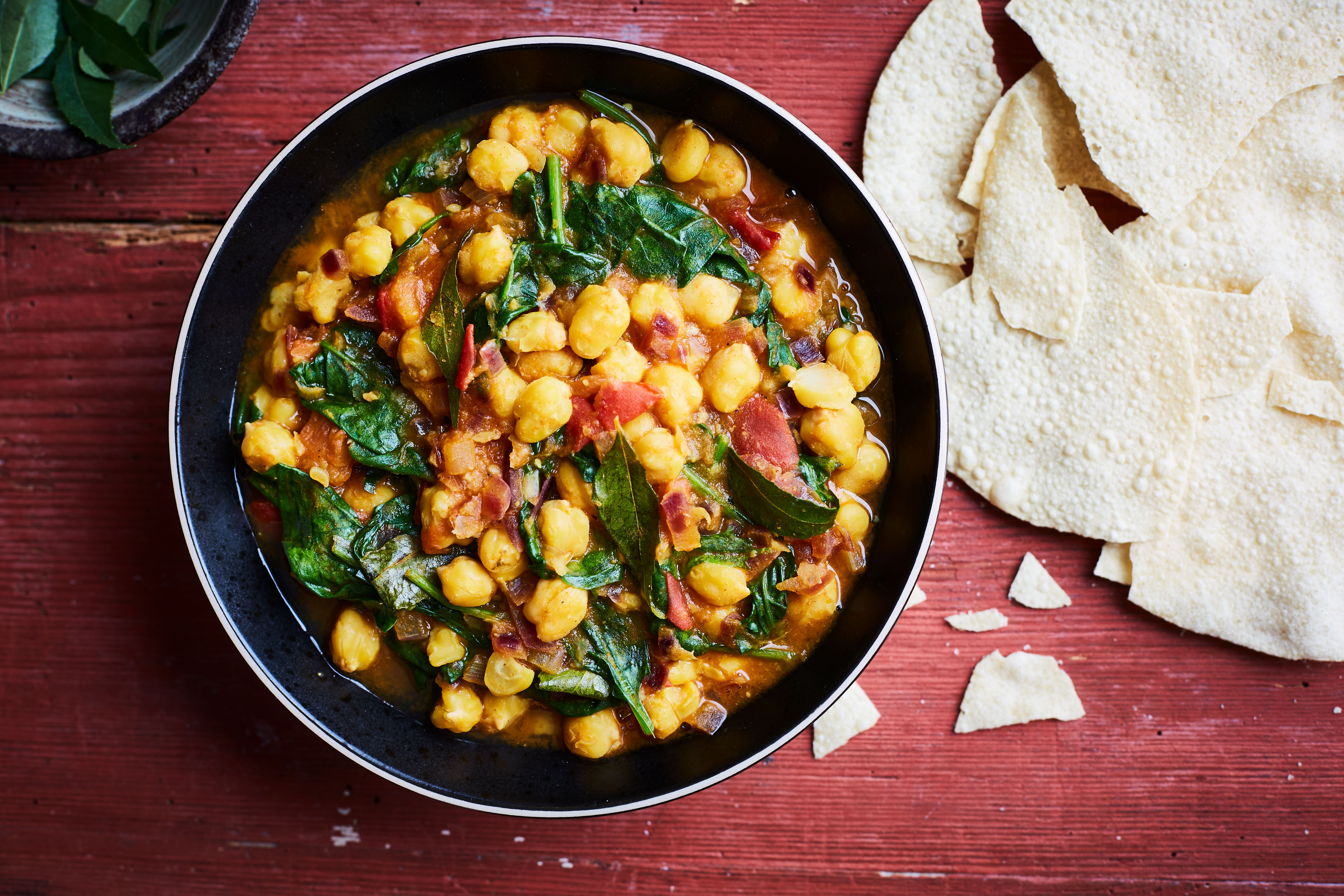 Heat the curry paste in a saucepan, add the onion and curry leaves and fry for 2-3 minutes over a high heat. Add the tomatoes, fry for a minute then pour in the chickpeas and water. Bring to a simmer then cook for 5 minutes. Stir in the spinach then remove from the heat and season to taste. Serve the curry with the poppadoms.