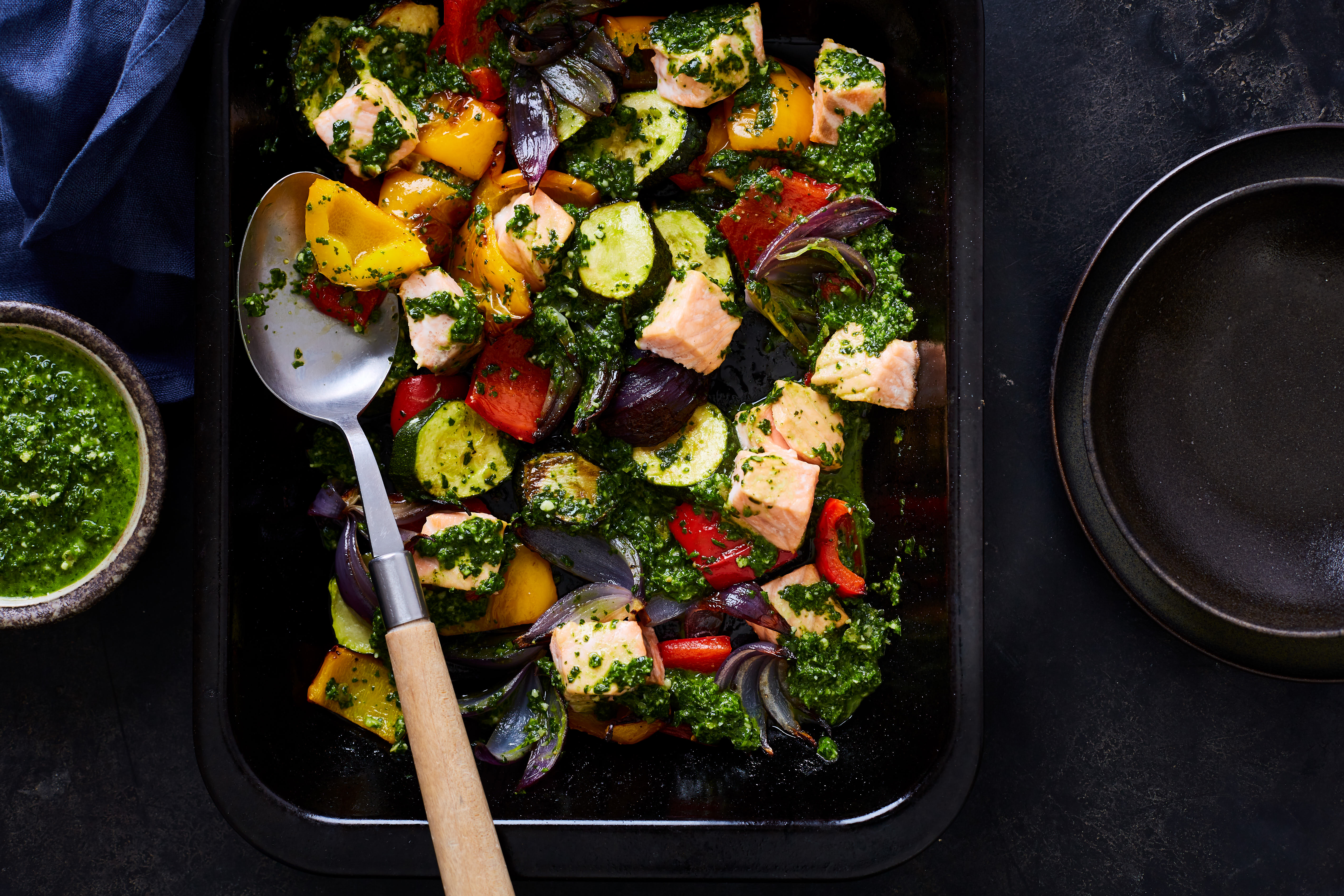 Whilst the salmon and vegetables are roasting, make the pesto. Combine all of the ingredients in a food processor with the remaining oil and a splash of water and blend to a coarse paste. Season to taste and serve with the roasted salmon and vegetables.