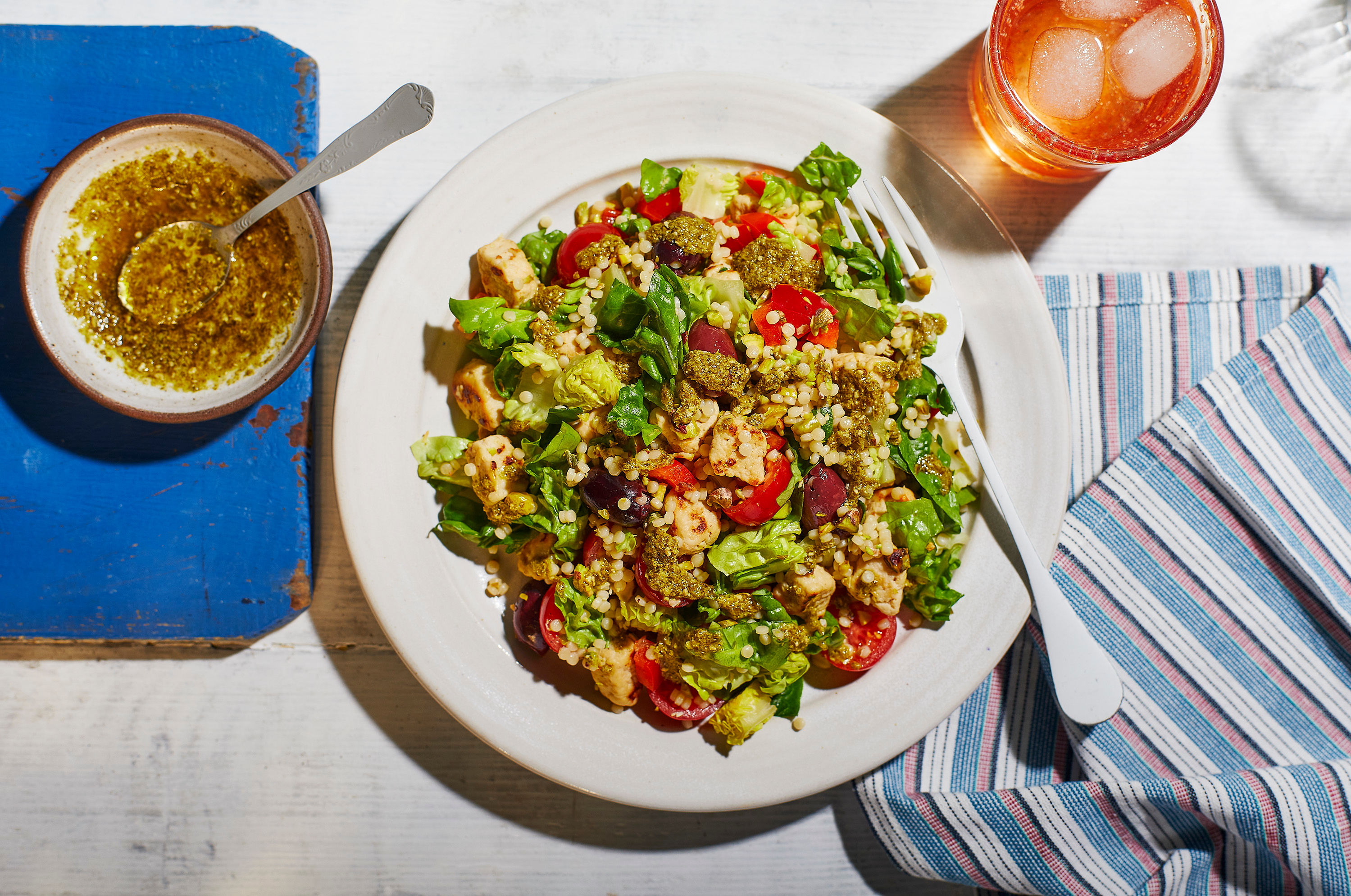 Whisk the pesto with a couple of tablespoons of water to loosen it to a drizzling consistency. Toss the chicken pieces together with the couscous, olives, lettuce, tomatoes, pistachios and pepper and drizzle over the pesto.