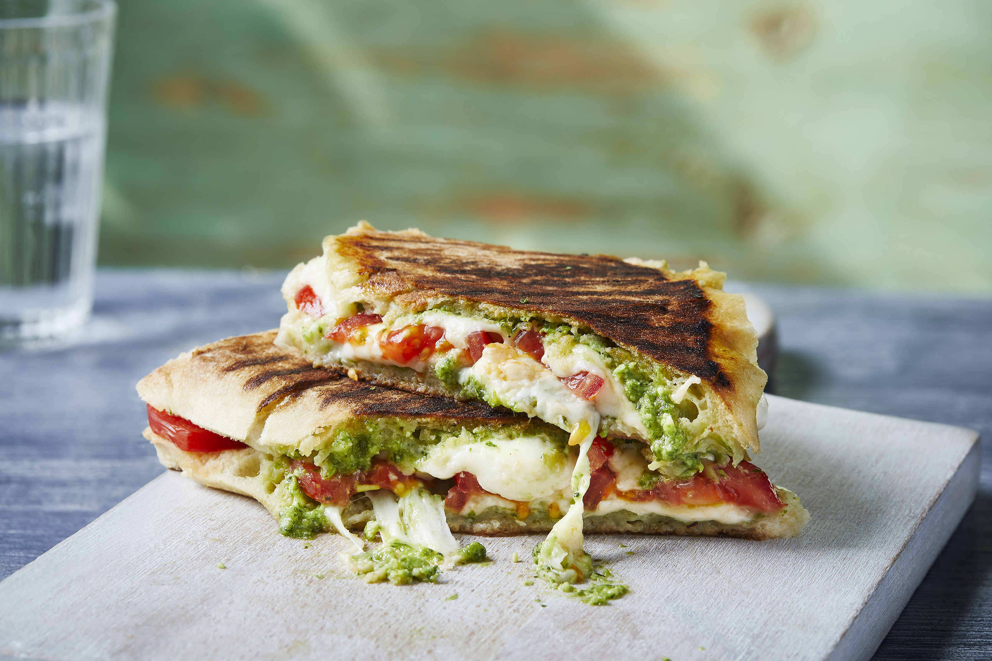 Spread the cut sides of the panini with the pesto. Top each half with the mozzarella, parmesan and tomatoes then press down firmly to seal.